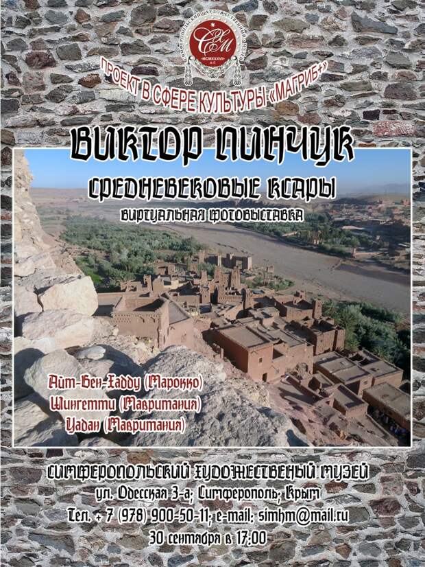 30 сентября 2025 года в Симферопольском художественном музее пройдет необычное мероприятие: путешественник, вернувшийся из четырёхмесячного бродяжнического "тура" по странам Северной Африки, расскажет о приключениях на "чёрном континенте", культурной миссии, которую осуществлял в качестве представителя России, а также — о проекте "Магриб+". Но это будет позже, — во второй части мероприятия; первая же часть включает демонстрацию виртуальной фотовыставки "Средневековые ксары". Посетители увидят Айт-Бен-Хадду, Шингетти и Уадан; а присутствие автора экспозиции позволит им прочувствовать атмосферу далеких экзотических, похожих на крепости, поселений.